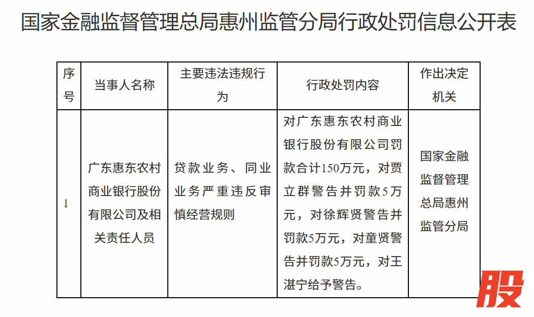 12月31日,国家金融监督管理总局惠州监管分局行政处罚信息公开表显示,广东惠东农村商业银行股份有限公司及相关责任人员因贷款业务、同业业务严重违反审慎经营规则被罚款合计150万元,贾某鱼群被警告并罚款5万元,徐某贤被警告并罚款5万元,童某警告并罚款5万元,王某宁被警告。