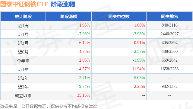 从业绩表现来看,国泰中证钢铁ETF基金过去一年净值涨幅为4.57%,在同类基金中排名1658/2233,同类基金过去一年净值涨幅中位数为11.94%。而基金过去一年的最大回撤为-22.05%,成立以来的最大回撤为-56.37%。