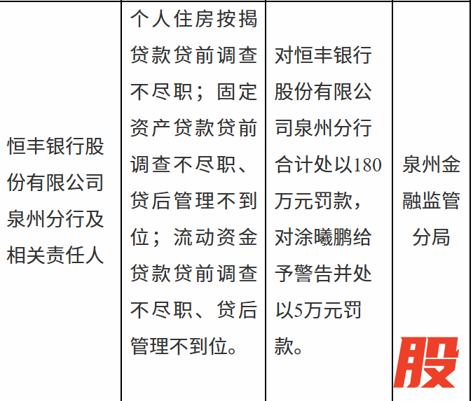 12月31日,泉州金融监管分局行政处罚信息公示表显示,恒丰银行股份有限公司泉州分行及相关责任人因个人住房按揭贷款贷前调查不尽职;固定资产贷款贷前调查不尽职、贷后管理不到位;流动资金贷款贷前调查不尽职、贷后管理不到位被合计处以180万元罚款,涂某鹏被警告并处以5万元罚款。